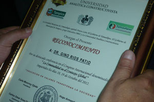 Distinción honorífica con la medalla Madre Tersa de Calcuta Premio Nóbel de la Paz, otorgada por la Sociedad Civil "Sembrando Valores".Doctor Gino Ríos Patio